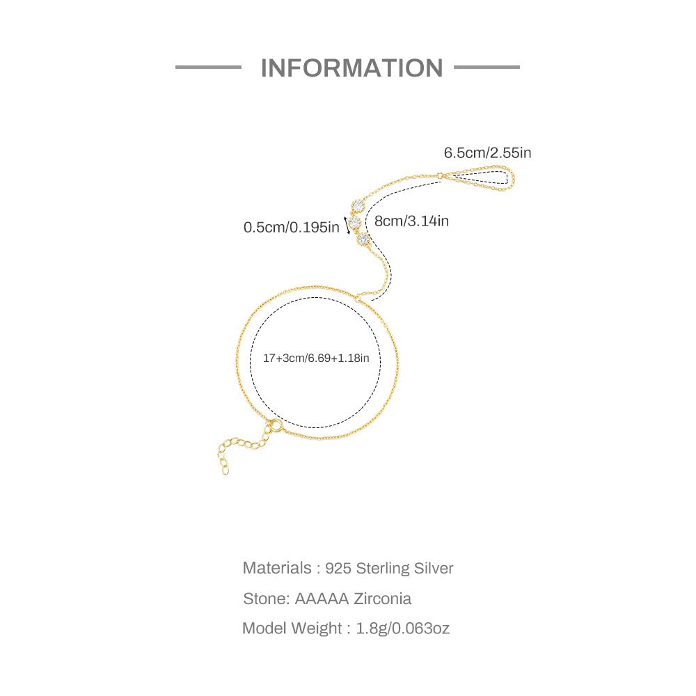 18K Gold plated Sterling Silver Three Zircon Hand Chain Dainty Adjustable Finger Bracelet ,birthday gift for her
