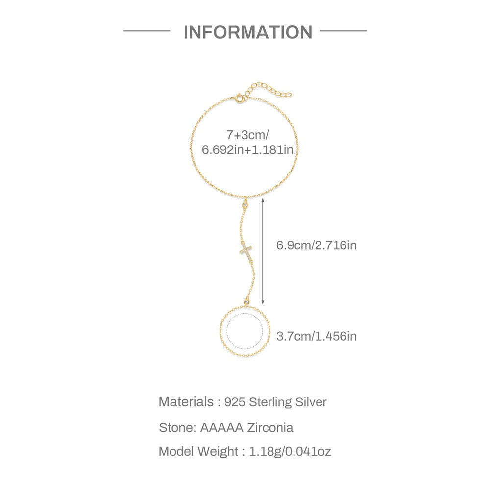 S925 silver bracelet, 18K gold plated sterling silver zircon hand Chain adjustable finger bracelet. Sterling silver Cross bracelet