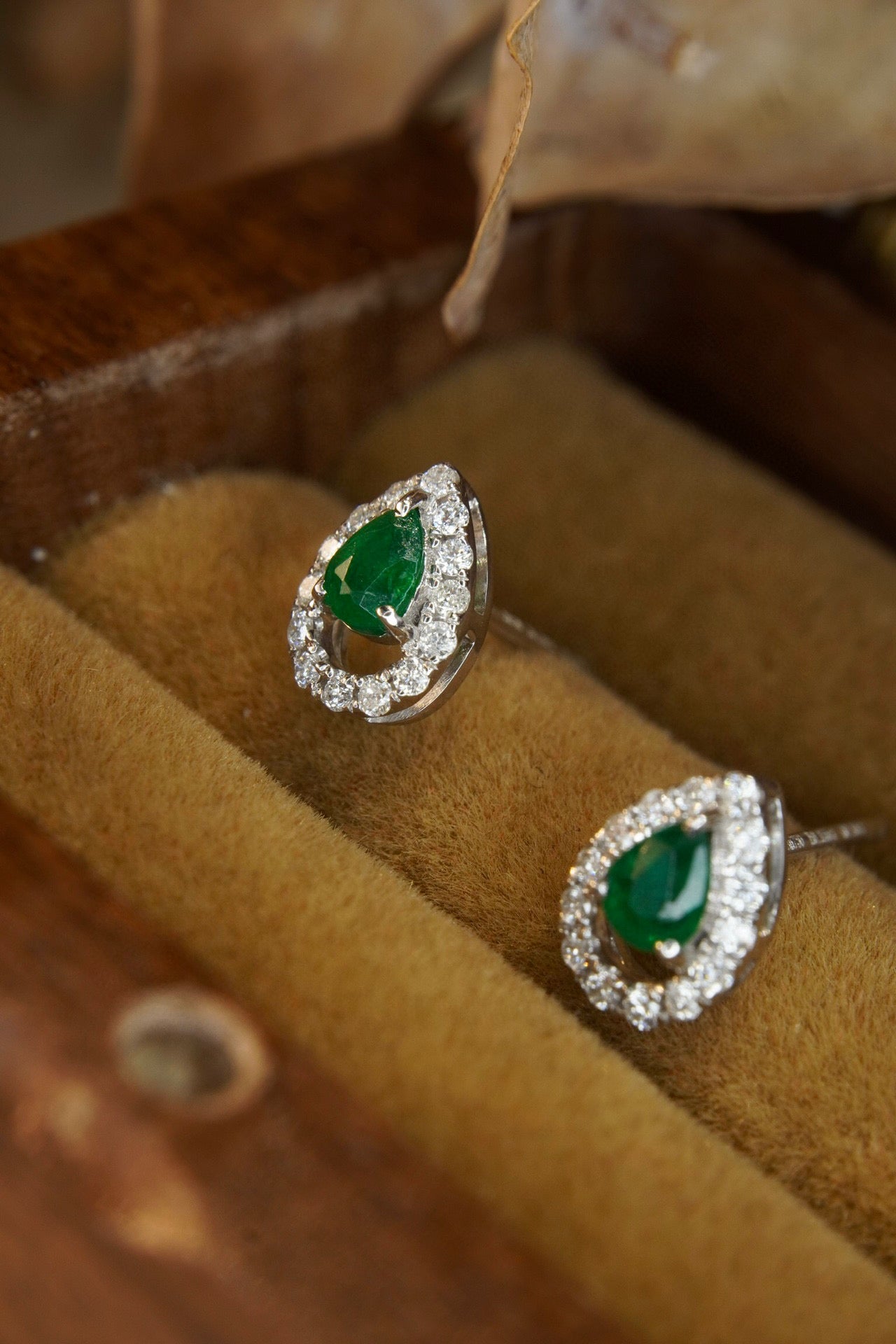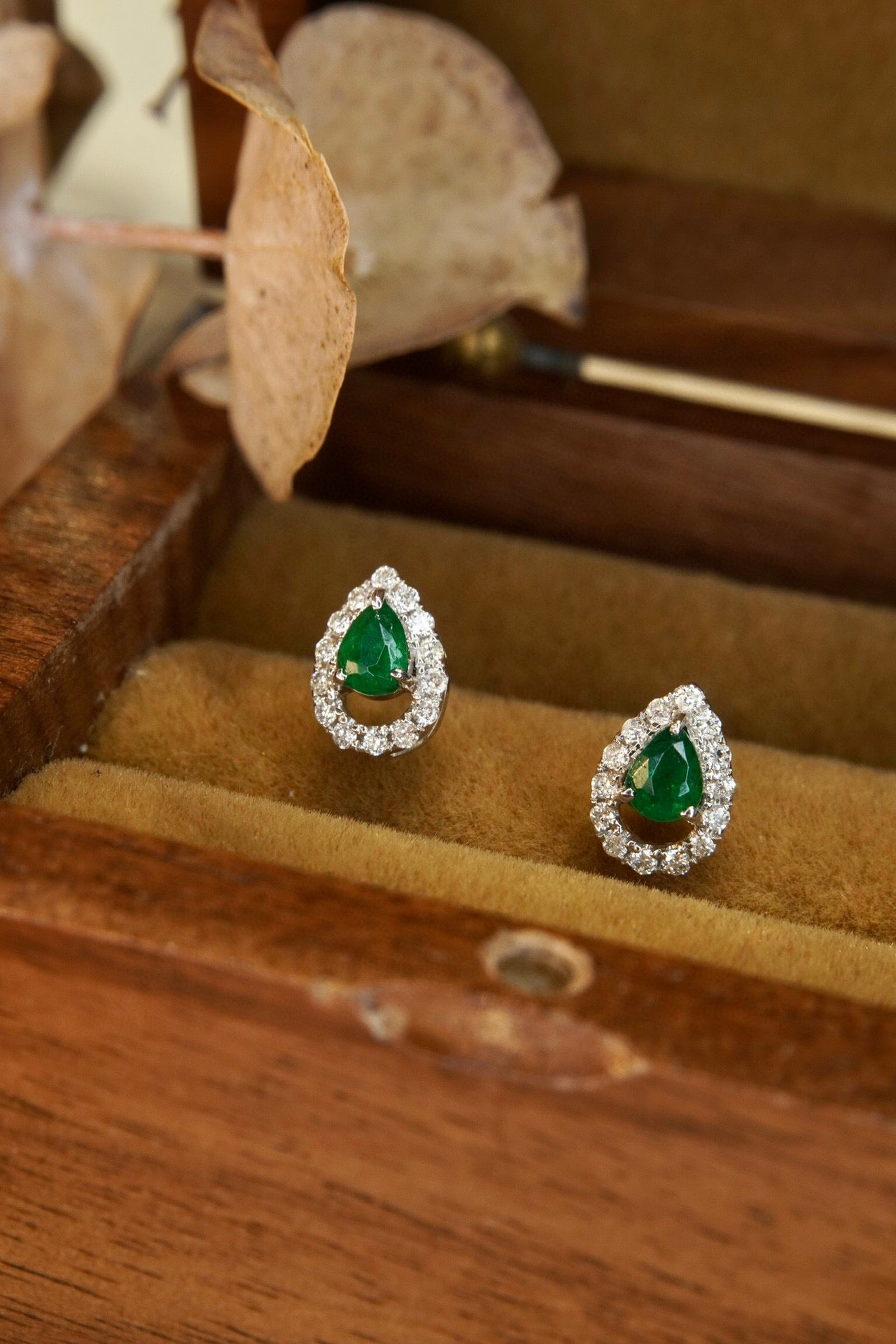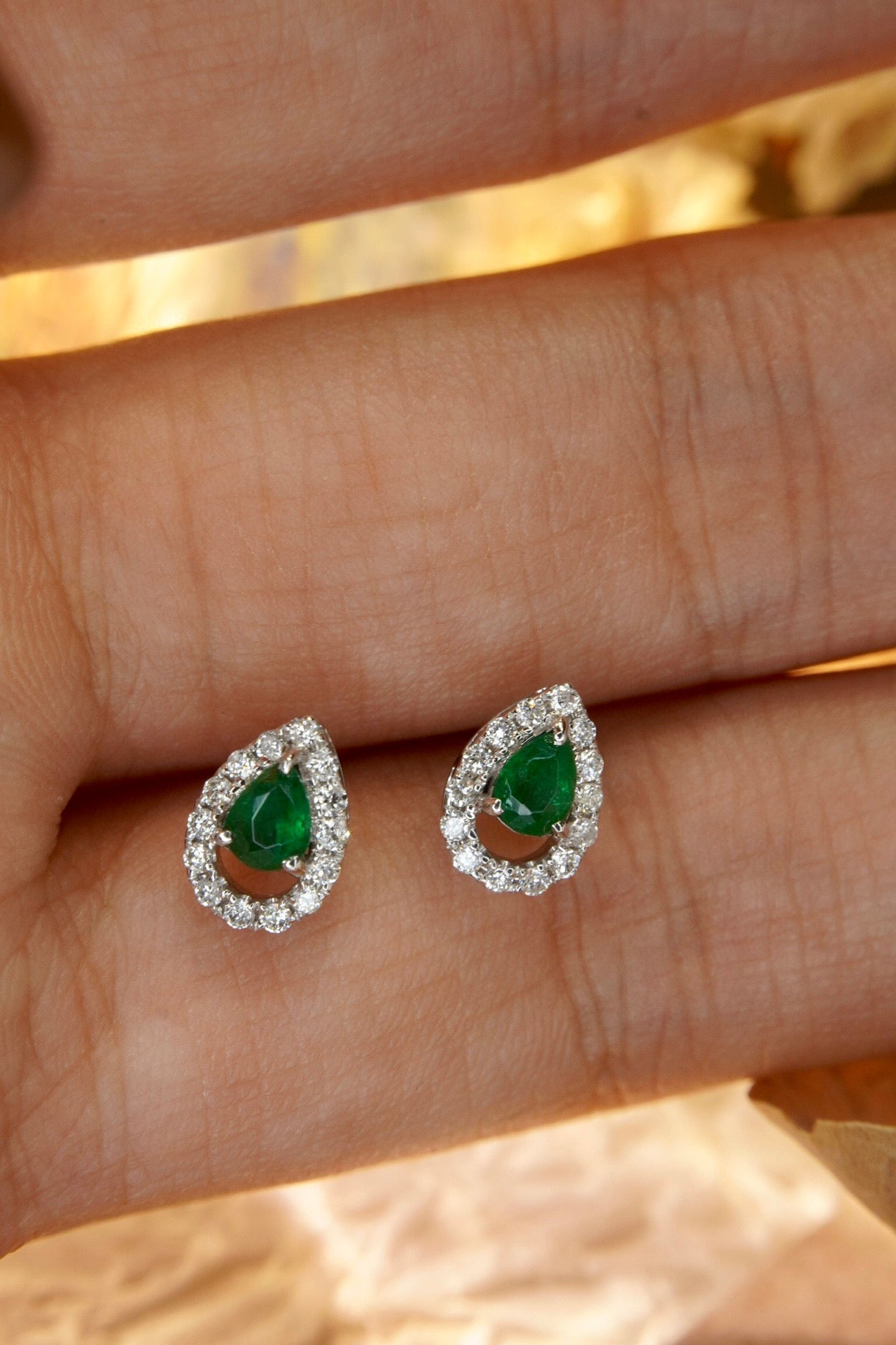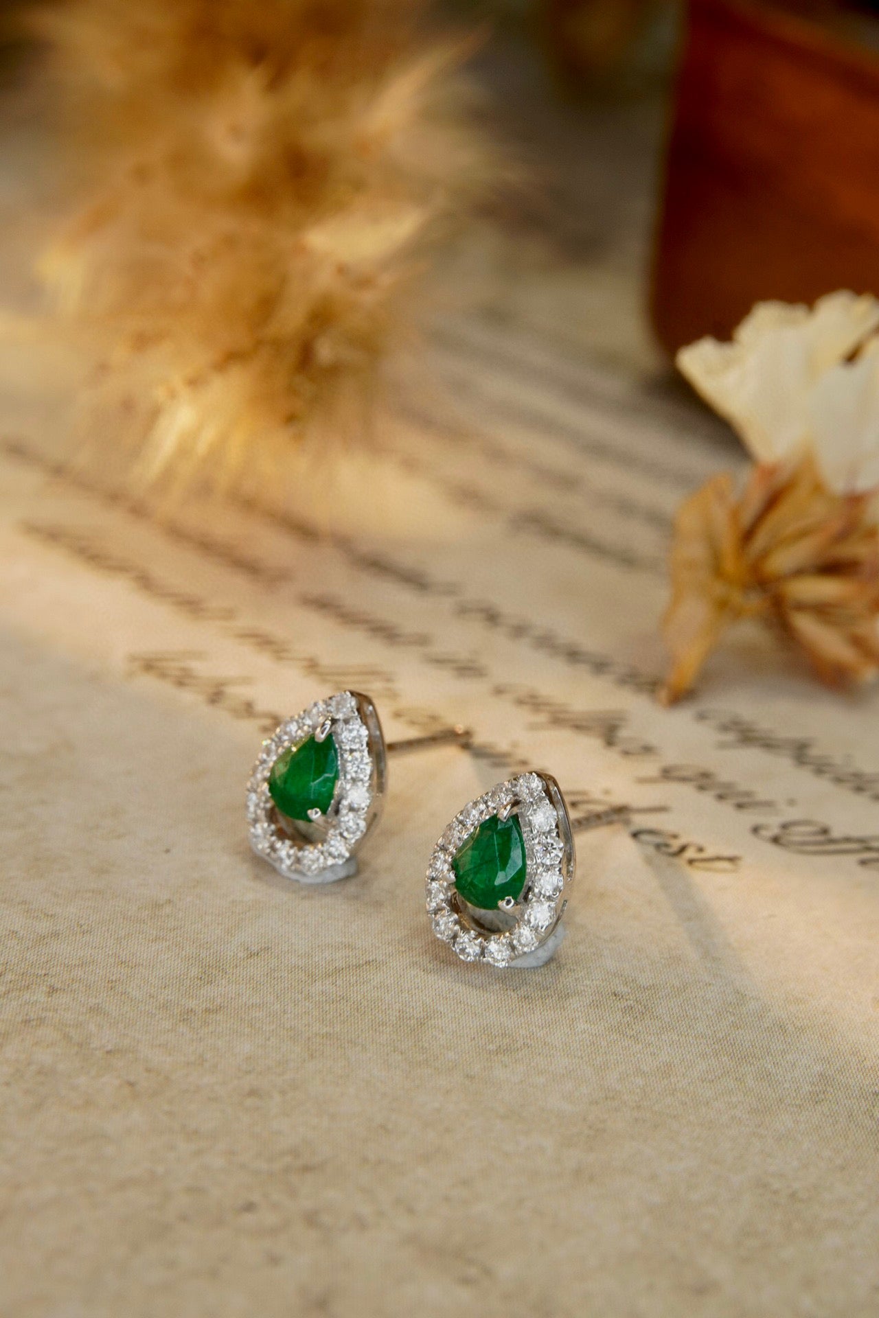 Classic 18K Solid Gold Genuine Emerald Diamond Stud Earrings