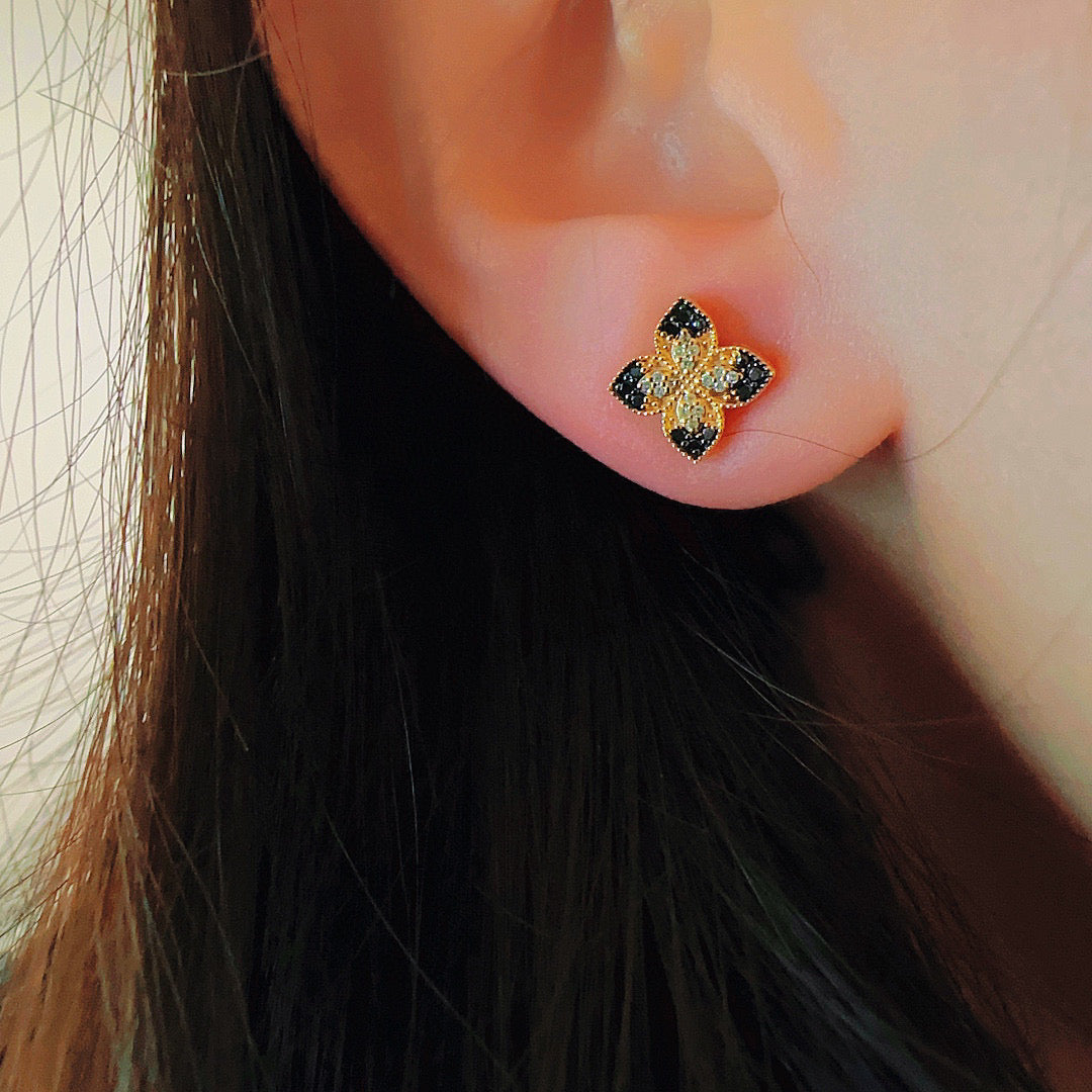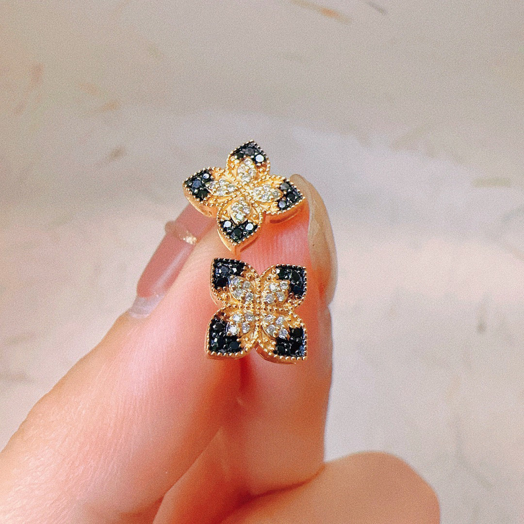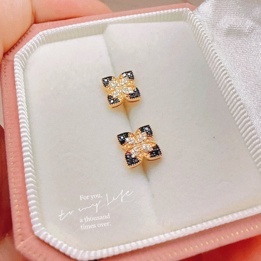 Vintage 18K Solid Gold Four Leaf Flower Stud Earrings,Black Diamond Earrings