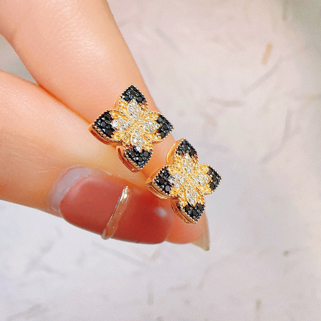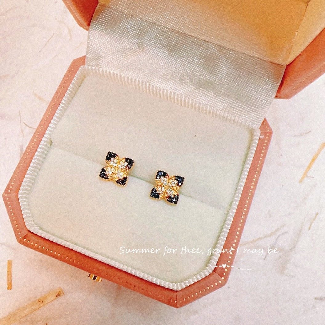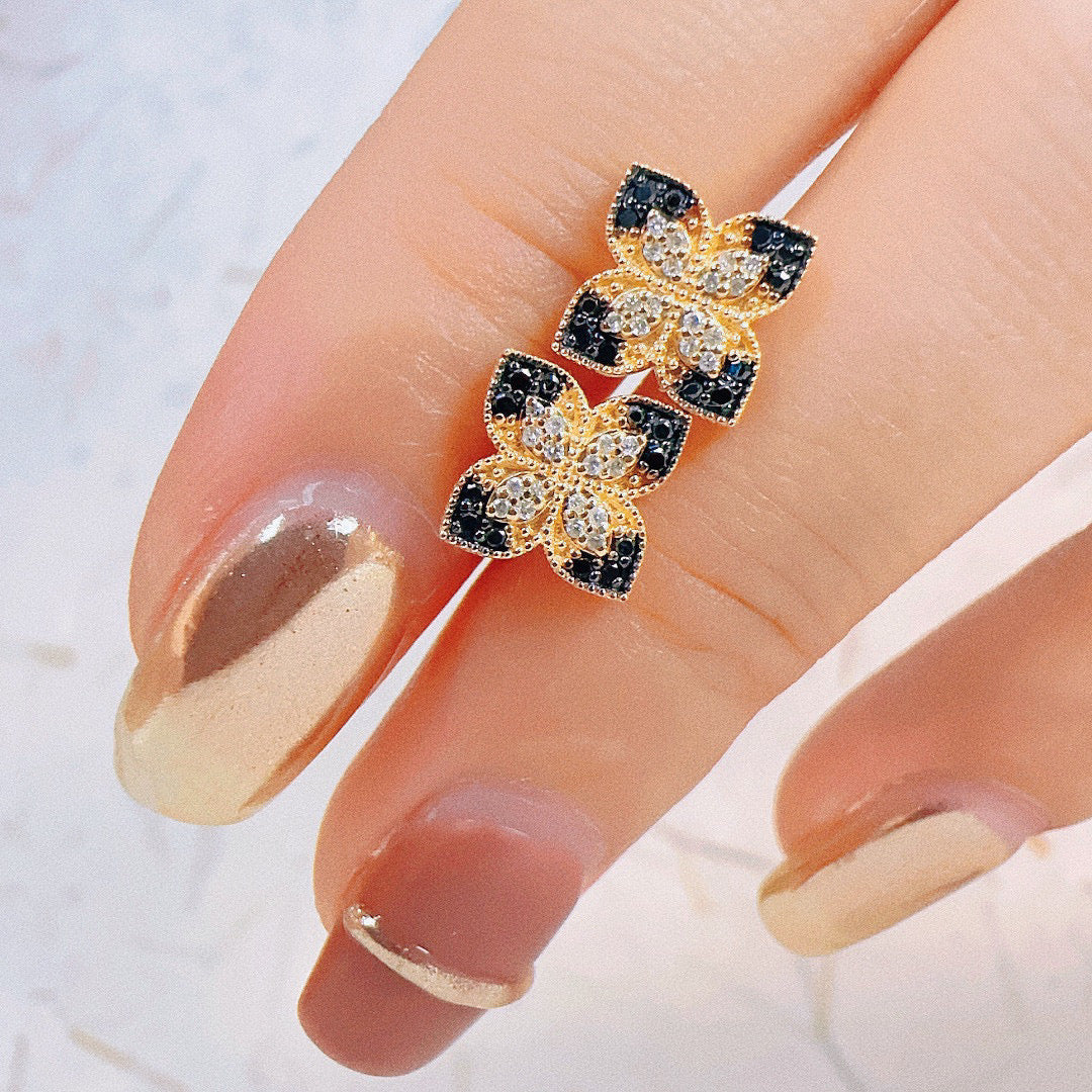 Vintage 18K Solid Gold Four Leaf Flower Stud Earrings,Black Diamond Earrings