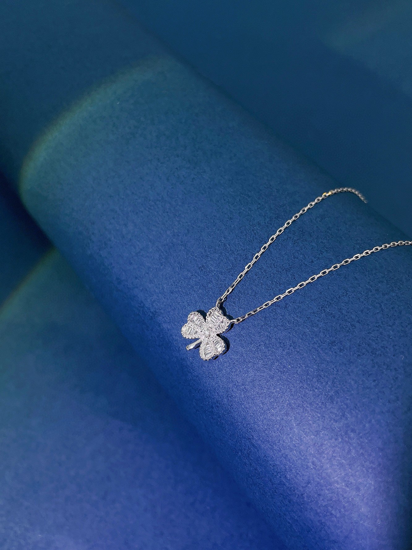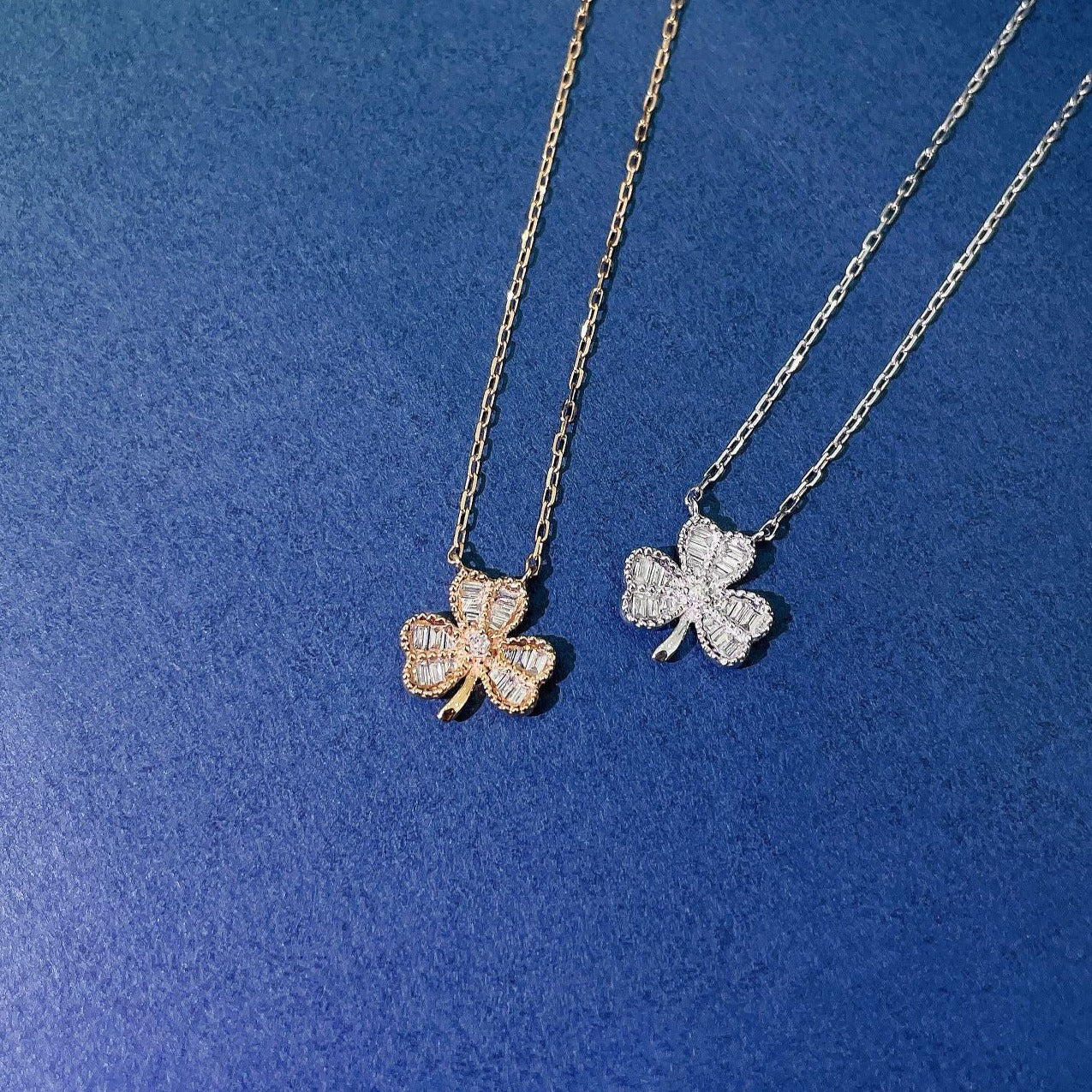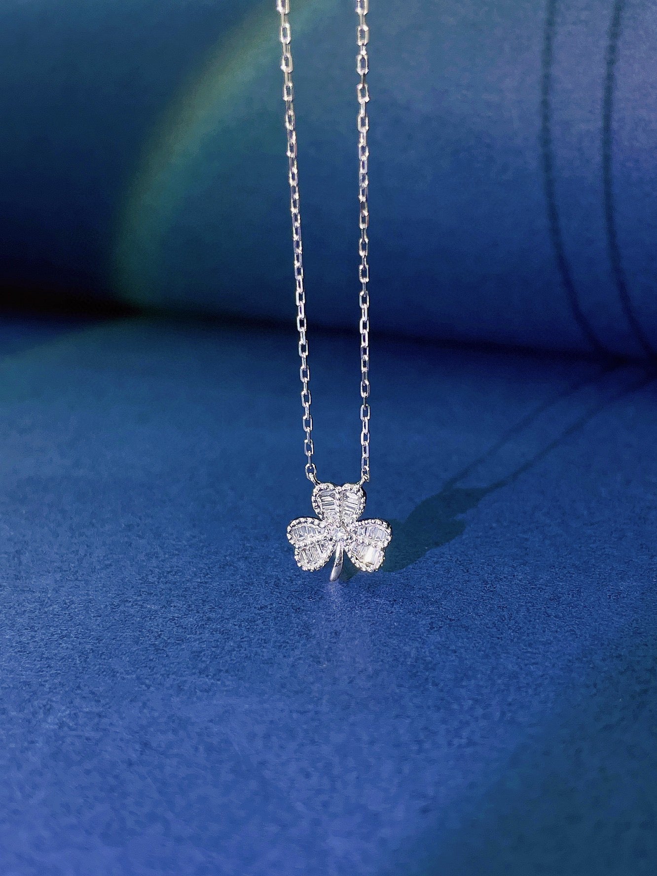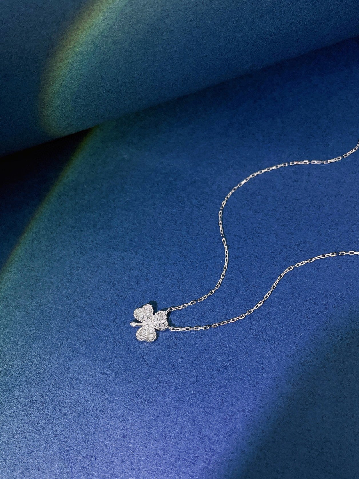Vintage 18K Solid Gold Full Diamond Three Leaf Clover Pendant Necklace