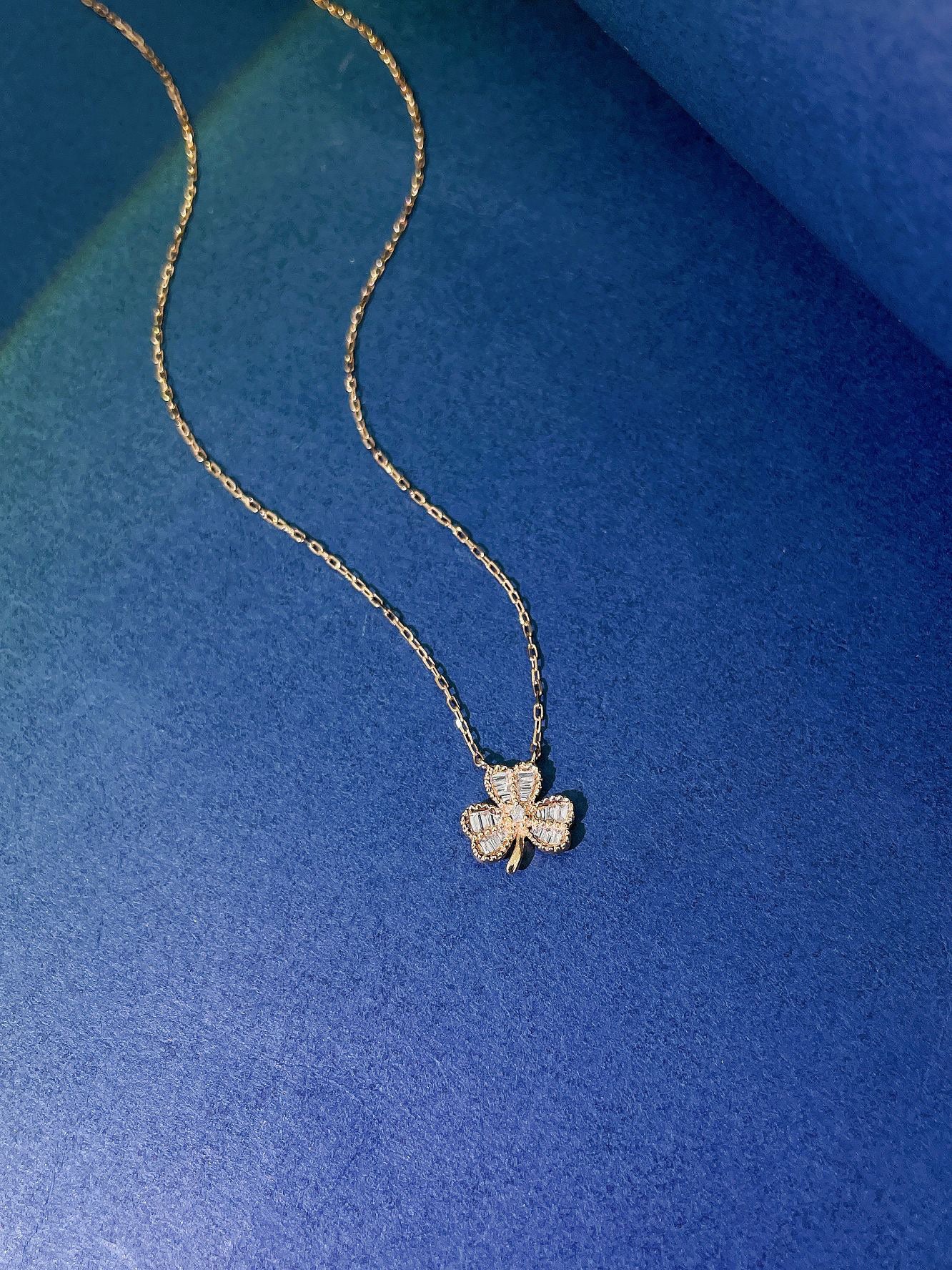 Item: Vintage 18K solid Gold Real Diamond Three Leaf Clover Pendant Necklace with certification